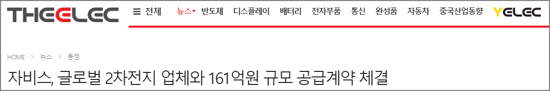 (기사내용) " X-레이 검사장비 제작 전문 업체인 자비스(대표 김형철)는 글로벌 2차 전지 제조사와 파우치형 배터리 X-레이 검사장비를 공급하는 수주 계약을 체결했다고 19일 밝혔다.