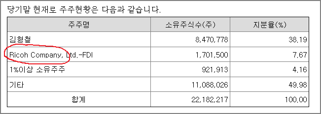 바로 거래소 상장 기업인 "신도리코" 때문입니다, 신도리코의 사명 뒷부분 리코가 일본 기업인 리코사입니다.