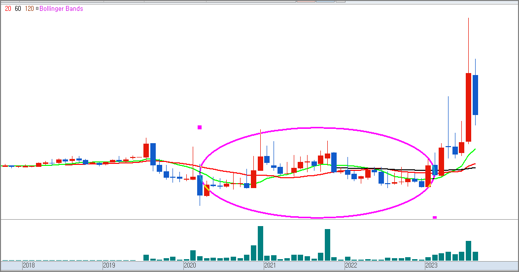 현재 월봉상에 보라색 원안에 파동이 3년 치 파동입니다 제가 보기엔 저 파동이 매집파동으로 보고 있는 데요 3년 이라면 긴 시간동안 공들인 그림 입니다. 23년 들어서면서 한차레 상승을 주긴 햇지면 아직 한참더 가야할 그림으로 보구 있습니다 3년간 공들인 저런 차트가 저 정도로 끝날수는 없다고 봅니다 , 다음은 일봉 차트입니다