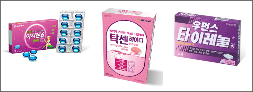 생리통은 파마브룸이라는 성분이 들어 있는 진통제를 사용하셔야 합니다. 이 성분은 이뇨 작용을 하기 때문에 부기를 빼주거든요. 그래서 생리하실 때 좀 붓기나 부종이 심하고 유방 압통이 있으신 분들한테는 이 성분에 특히 효과적이에요. 해당 제품에는 이부브로펜에 파마브룸이 섞여있는 "이지앤 6 이브" "탁센 이브" 그리고 "우먼스 타이레놀"은 아세트아미노펜에 파마브롬이 섞여있는 제품입니다.