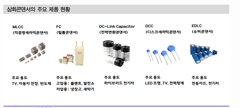 삼화콘덴서는 국내에서 유일한 콘덴서 종합 메이커로, 삼화전기의 자회사로 거의 모든 콘덴서를 생산하고 있는 기업입니다.