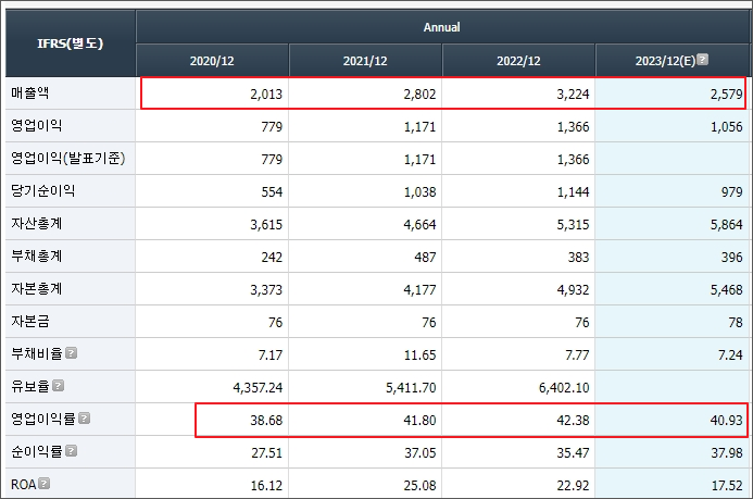 영업이익률이 20년 38프로, 21년 41프로, 22년 42프로, 제조업체에서 이 정도 이이율은 막말로 미친 겁니다.
