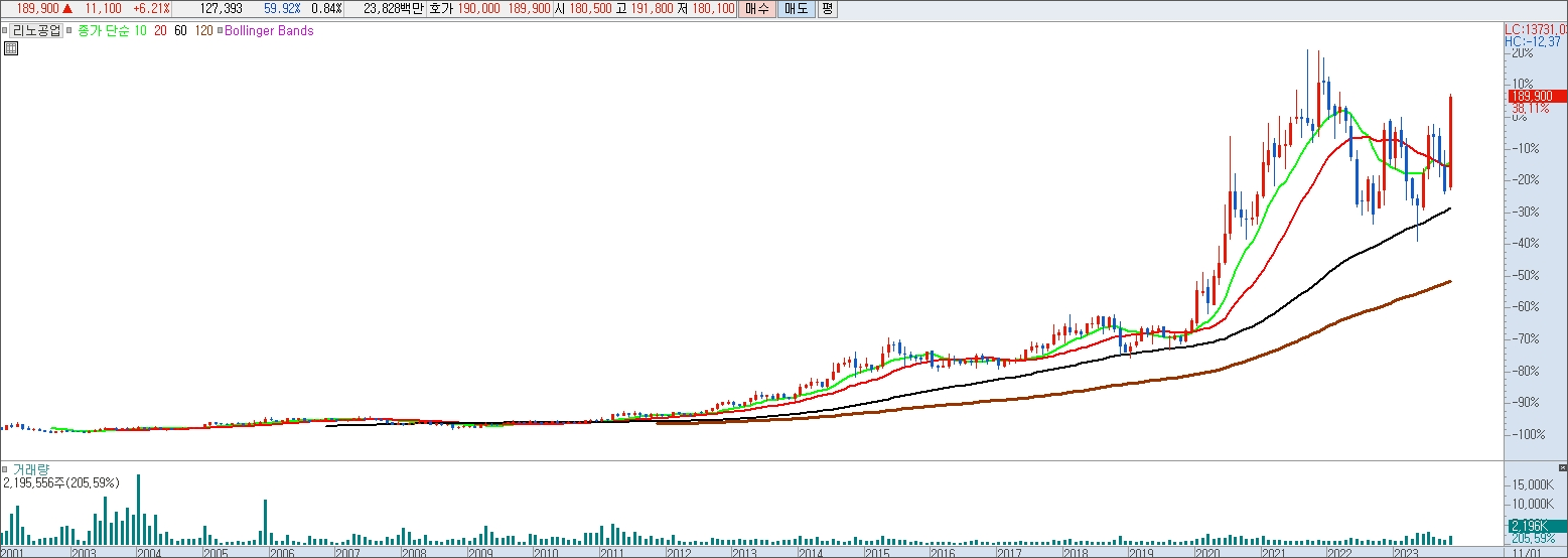 리노공업의 월봉입니다 2001년 초에 상장이 되어서 23년 11월 21 현재까지의 흐름입니다.