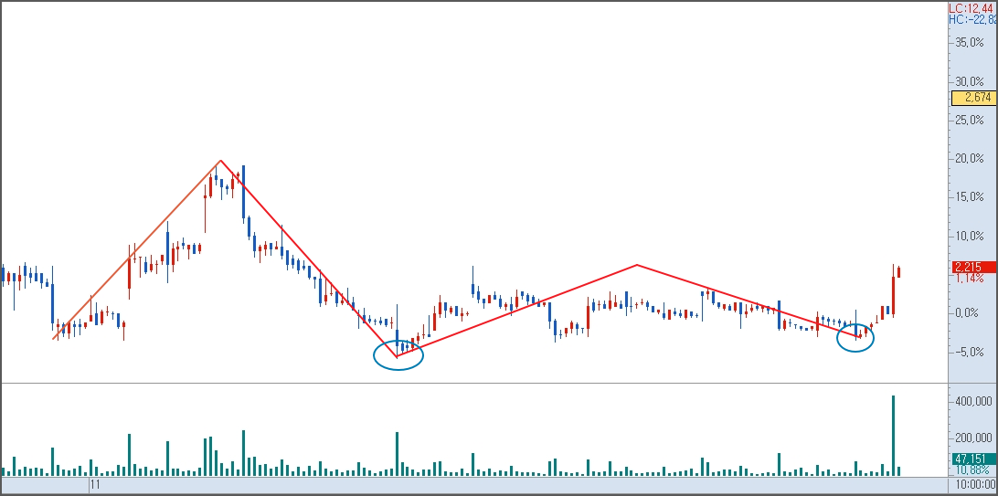 우선 기술적으로 한번 접근해서 살펴볼 필요가 있어 보이는데 그동안 20만 주도 안 되는 거래량을 보이면서 거래바닥을 드러내고 있다 오늘 한 시간 만에 40만 주 이상 거래가 터지고 있다 , 금일 이런 추세면 종가까지 100만 주 이상 거래가 터질 가능성이 많아 보임