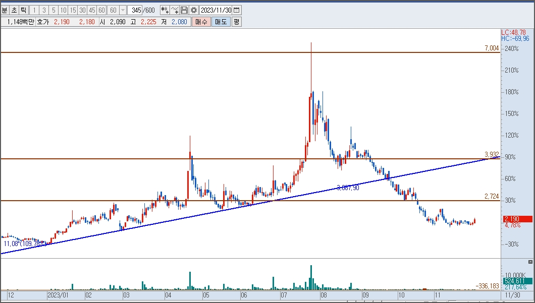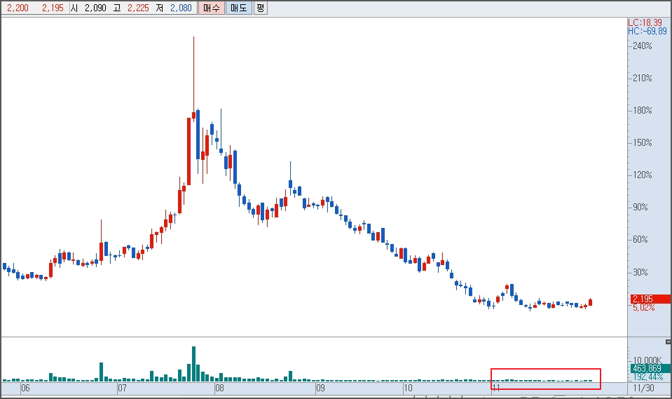 위에 일봉을 보면 거래 바닥을 보이는 구간에서 2차 전지가 크게 하락을 하는 날에도 가격의 변동이 별로 없이 보합상태를 유지하는 등 하방경직을 보여주고 있었는데 그 구간이 11월 20일경부터였음