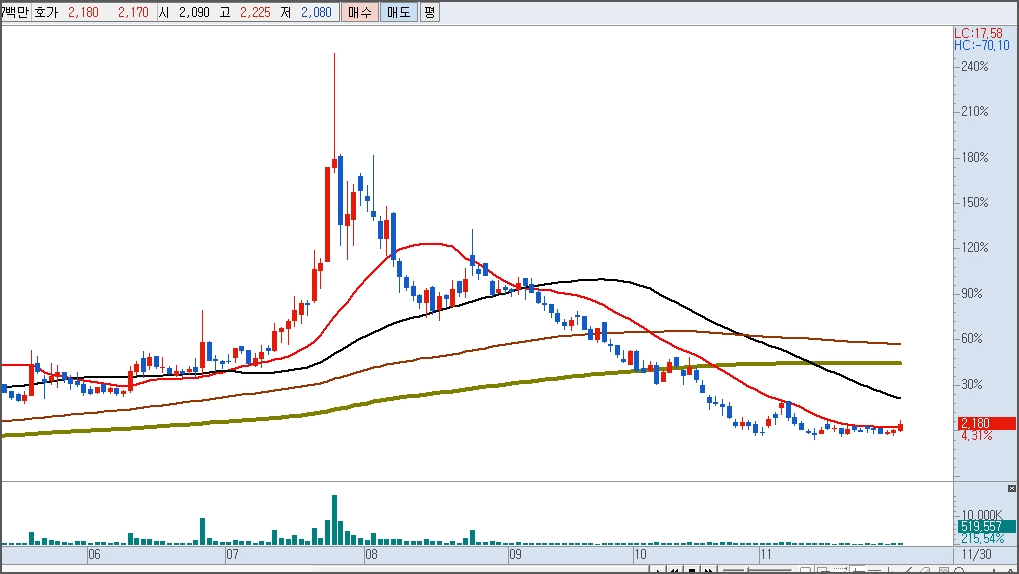 현재 역배열 상태에서 다시 몸을 추스르는 정도임, 위에 저 많은 이평들이 강한 저항대로 작용하므로 수많은 공방전을 펼쳐야 될 듯, 상당한 시간이 필요할 듯, 하지만 오늘의 흐름으로 일단 더 이상의 큰 하락을 없을 것이라는 안도의 차트를 만들어 준 것에 만족해야 될 듯