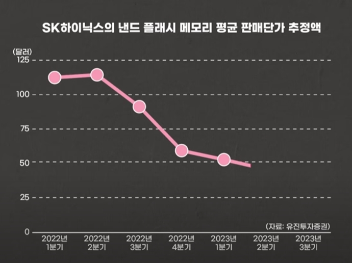SK가 인수하자마자 낸드플래시 메모리 가격이 폭락을 하게 되죠, SK하이닉스의 낸드플래시 메모리 평균 판매 가격은 작년 1분기만 해도 테라바이트당 12달러였는데 23년 2분기에 46달러로 60% 가까이나 폭락했죠, 이 탓에 SK하이닉스의 낸드 부문 적자는 분기당 2조 원을 넘어서게 됩니다.