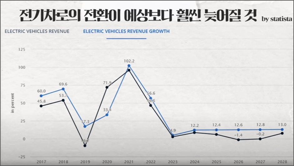 지금 위 그래프의 파란색 선이 전기차에 매출 성장률입니다. 2017년부터 2021년 22년까지는 진짜 말 그대로 엄청난 초고속 성장을 했던 게 사실이에요. 2021년 보시면 거의 2배 가까운 성장을 했어요. 그런데 문제는 2023년이죠. 4.9% 성장밖에 못 했습니다.