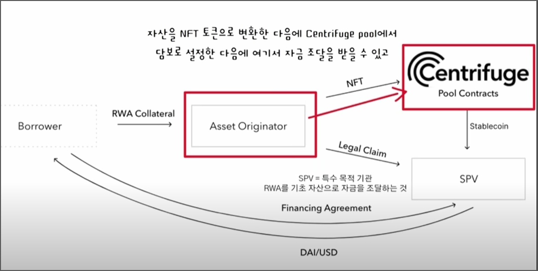 센트리퓨즈는 실물 자산을 온체인으로 가져오는 프로토콜입니다. 설명하자면, 자산 발행자는 토큰화된 자산을 담보로 대출을 받을 수 있는데 이 센트리퓨즈가 일단 실물 자산을 토큰으로 변환한 다음에 센트리퓨지풀에서 담보로 설정한 다음 자금 조달을 받을 수 있고, 여기서 담보금만큼 풀 예비금에서 스테이블 코인이 인출이 되면 SPV 지갑으로 이동을 하는데 여기서 DAI를 USD로 코인을 교환을 한 다음에 차용자 계좌에 돈을 보내는 방식입니다.