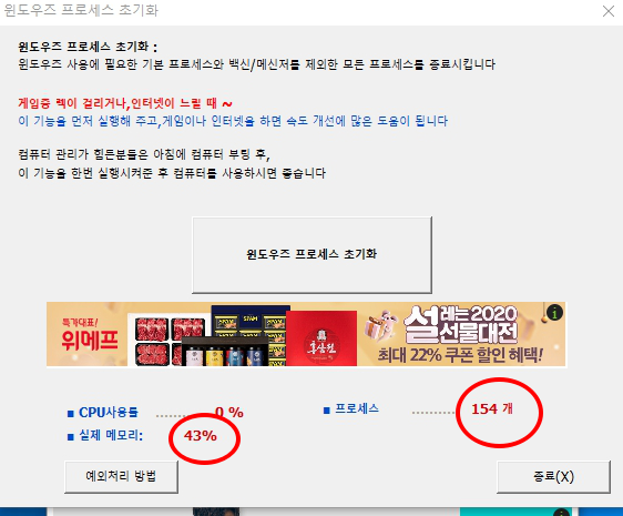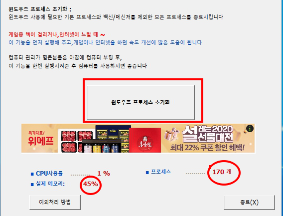 "윈도즈 프로세스 초기화"메뉴를 실행하고 난 후